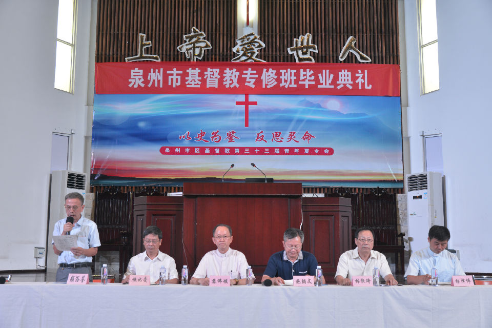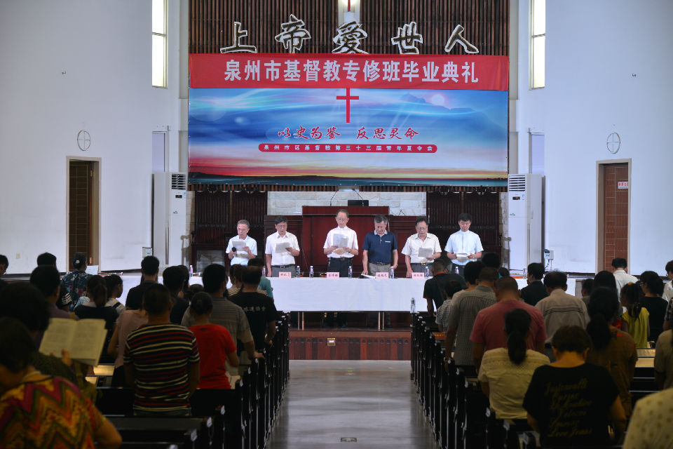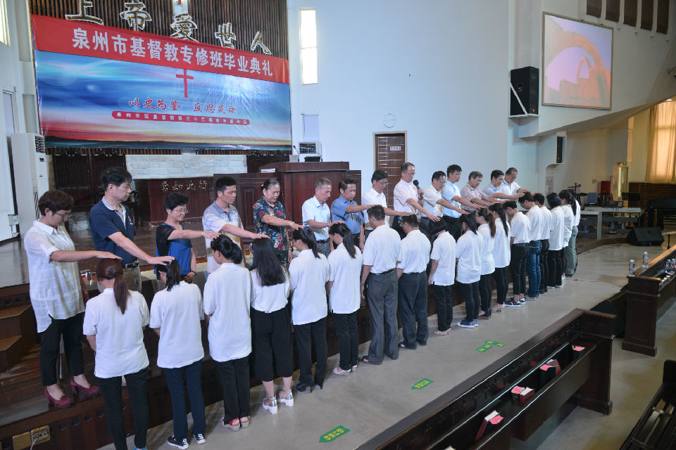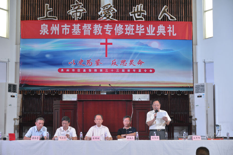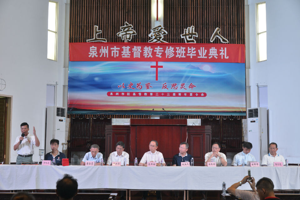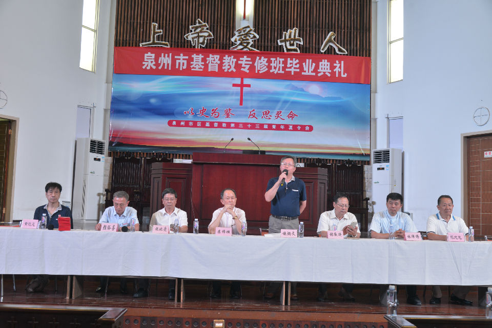 2016年7月8日上午8:30--9:30,泉州市基督教神学培训中心首届神学专修班毕业典礼在泉南堂隆重举行。黄德恩长老、颜浴荃牧师、施比受牧师、苏伟垣牧师、施炳文科长、林敦琦牧师、林泽伟牧师、陈志忠长老出席了毕业典礼。