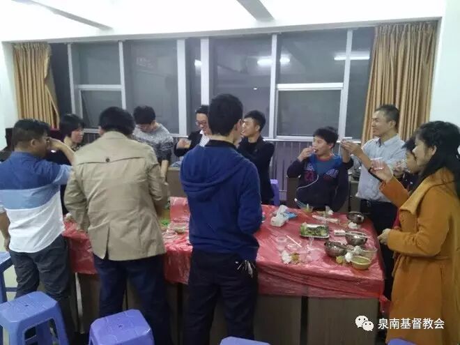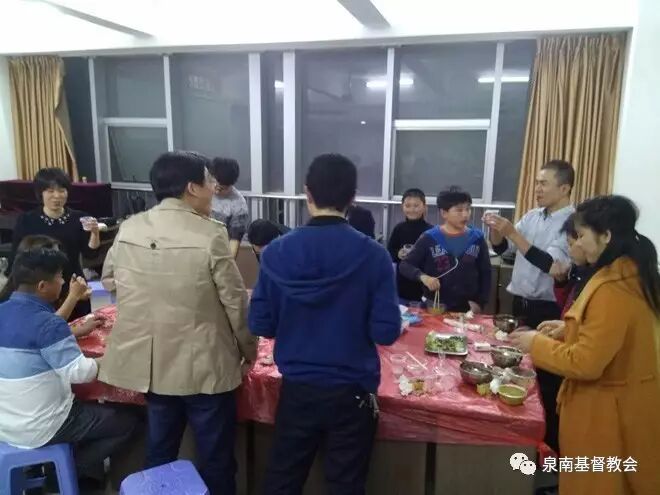 2017年1月8日晚6点,泉南堂单身团契弟兄姐妹二十多人在堂会五楼欢聚一堂,共享“爱宴”。林世文牧师带领开始前祷告。余彩珍传道和大家一起颂赞主恩!祝愿大家在新的一年更加爱主!更加蒙福!